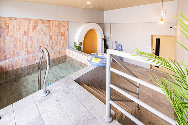 • 孩子們在戲水池開心玩水,大人則在戶外沙發區喝茶看海